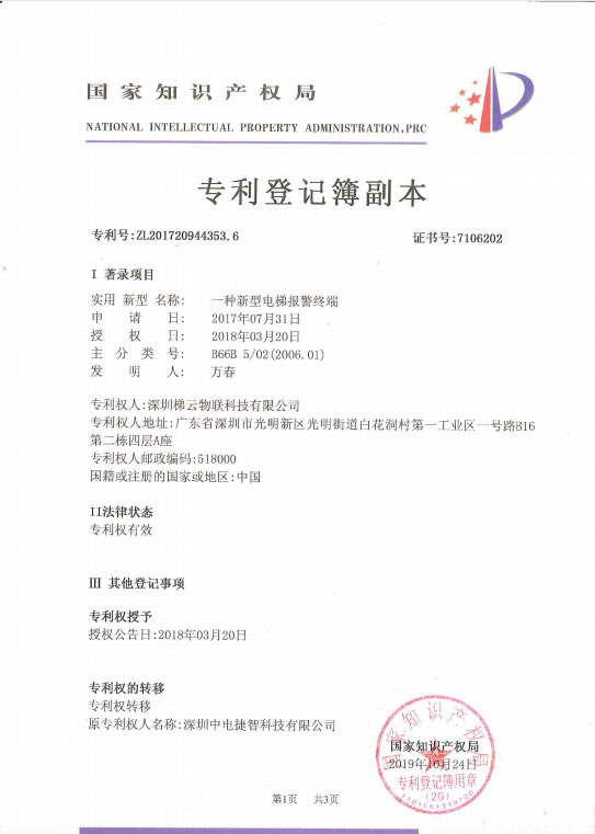 專利 電梯報警終端專利證書